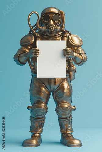 Bronze Robot Diver Holding Blank Sign