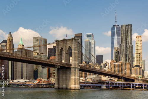 Brooklyn bridge and downtown NYC skyline. from the East River.