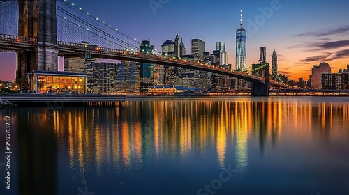 Brooklyn Bridge with Reflections of Manhattan Skyline at Dusk
