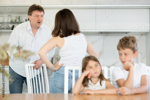 Brother and sister sitting at table in kitchen listening to quarrel of their mom and dad