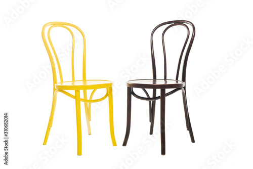 Brown and yellow wooden chairs isolated on white