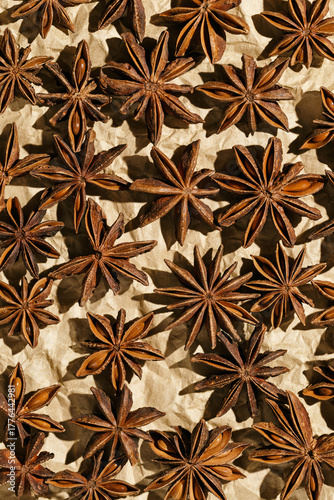 Brown Anise stars as pattern at sunlight, top view close up aromatic spices dried aniseed on beige paper, minimal aesthetic food, textured background, natural season traditional condiments