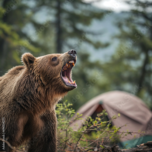 Brown bear roaring in the forest near a tent