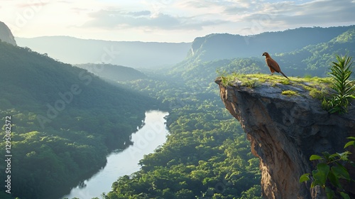 Brown Bird on Clifftop Overlooking Lush Green Valley and River