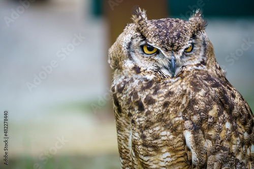 Brown, black and white Eagle Owl with the background out of focus