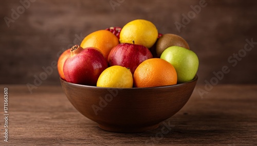 Brown bowl filled with assorted fruits apples oranges lemons pomegranate kiwi on a wooden table