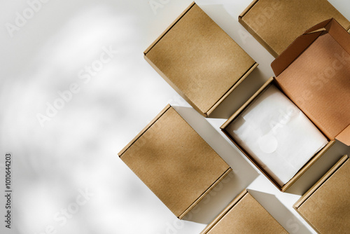 Brown cardboard boxes arranged on a neutral background in a warehouse setting during daylight hours