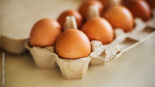 Brown chicken eggs lie in a cardboard store box, are on a white table and illuminated by sunlight. Healthy food for breakfast.