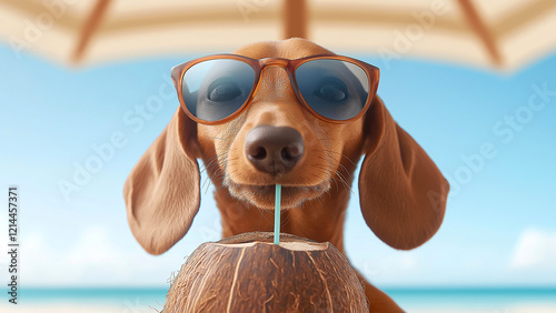 Brown dachshund dog wearing sunglasses drinking from a coconut under a beach umbrella on a sunny day