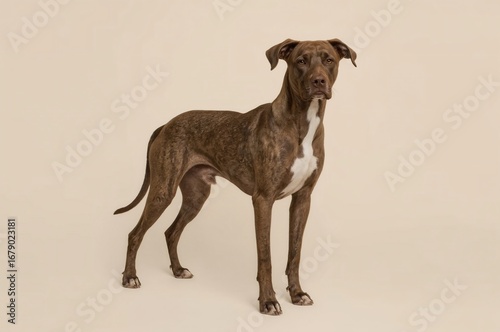 Brown dog posing studio beige background adoption