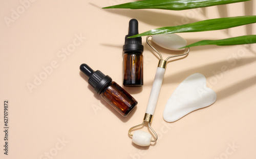 Brown glass bottle with a pipette, a white stone hand massager and a scraper for cosmetic procedures on a beige background, top view