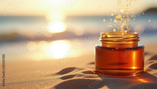 Brown glass jar for cream or oil container on beach sand. Golden fluids coming out of it. Skincare products during vacation, skin protection, spa-hotels and relaxation
