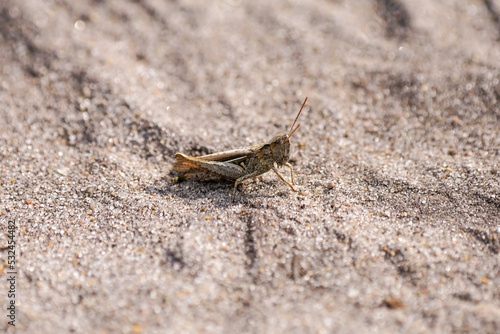 Brown grasshopper on sandy ground. Chorthippus brunneus.
