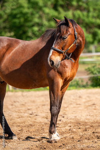 Brown horse in bridle standing quietly in horse farm. Outdoors on a bright summer day.