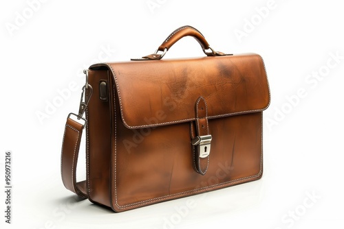 Brown leather briefcase on white background with shadows