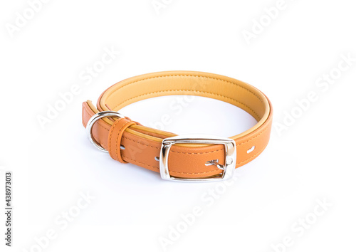 brown leather dog collar silver buckle isolated on white background.