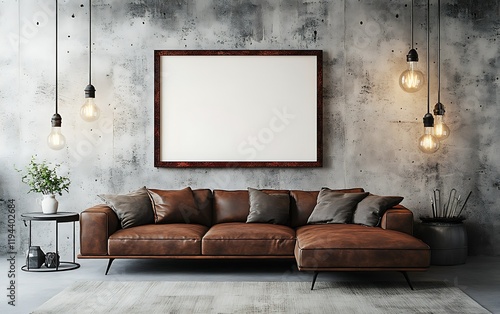 Brown leather sectional sofa in industrial loft interior with blank frame mockup