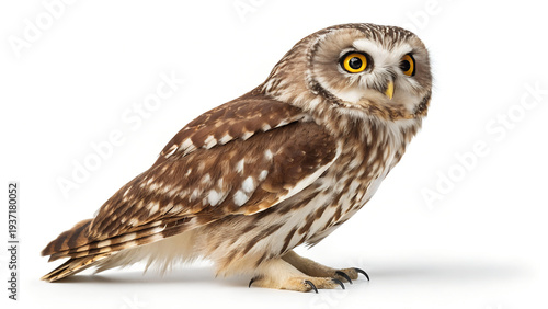Brown owl with white spots on a plain background