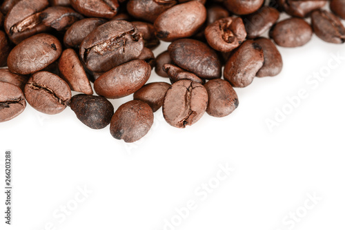 Brown roasted coffee beans, macro close up, isolated on a white background
