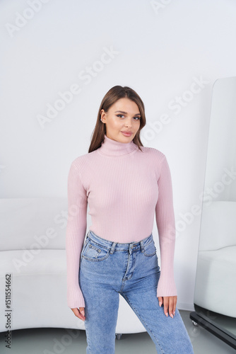 Brunette model in a pink turtleneck sweater poses in modern indoor setting