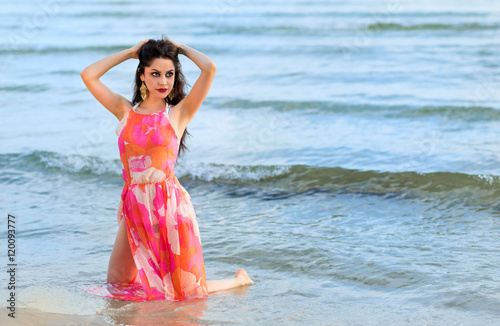 Brunette model photo posing on Swedish beach