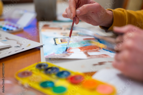 Brush in hand above watercolor painting. Colorful medieval city street on paper board.