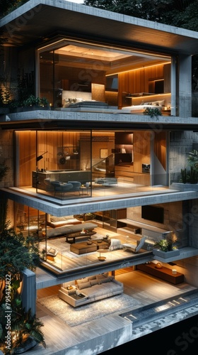 b'Three-story house with modern design and large glass windows'