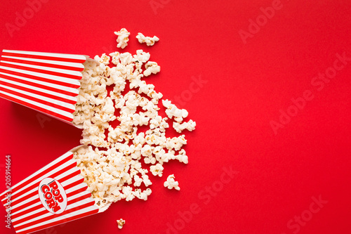 Bucket of popcorn on red background, top view