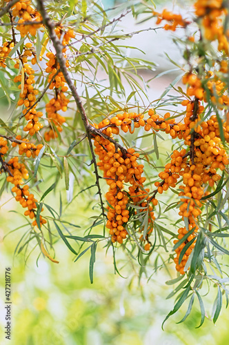 Buckthorn berries on the branch of sea-buckthorn tree. Photo closeup. Selective focus. Vertical crop.