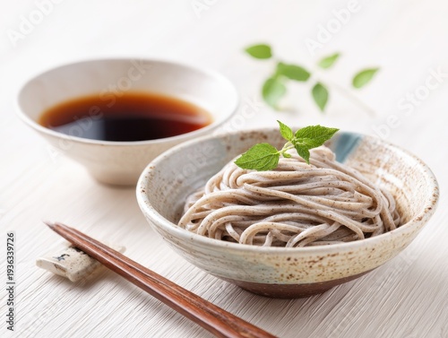 Buckwheat Soba Noodles Served in a Rustic Bowl with Dipping Sauce and Green Garnish on White Table