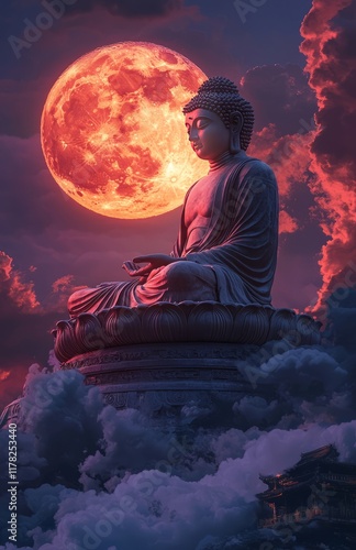 Buddha Statue Meditating with Glowing Full Moon and Mystical Clouds