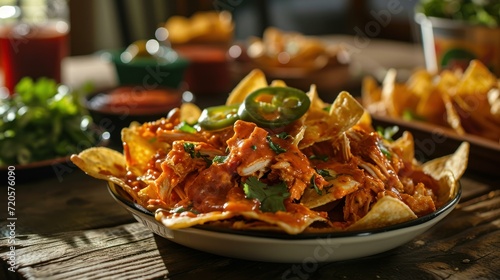 Buffalo Chicken Nachos against a wooden table