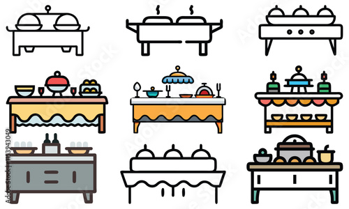 Buffet Table Illustrations in Color and Line Art, Set of nine buffet table illustrations in colorful and black-and-white line art styles, featuring food, trays, and decor for dining or catering themes