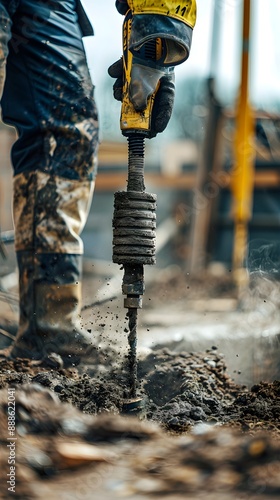 Builder using hammer drilling equipment in the ground The background is a construction site
