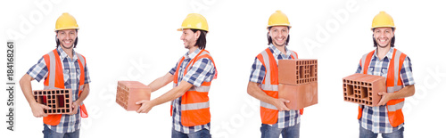 Builder with clay bricks isolated on white