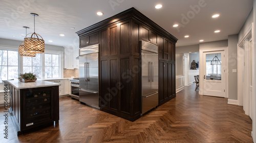 Built-in Double-Door Fridges with Dark Wood Panels in Luxury Kitchen