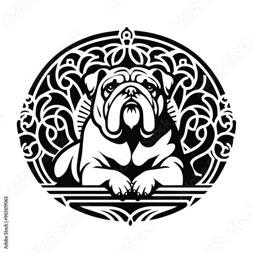 Bulldog with art nouveau decoration, stencil logo, black and white animal illustration