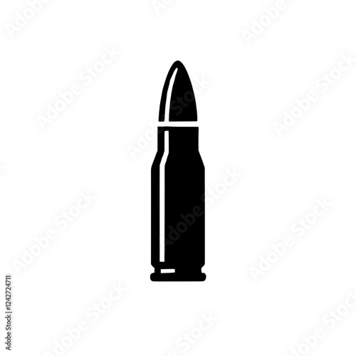 Bullet Icon: A minimalist, bold black silhouette of a bullet, capturing a stark and symbolic image of weaponry. This vector illustration is ideal for conveying themes of danger, power, or conflict.