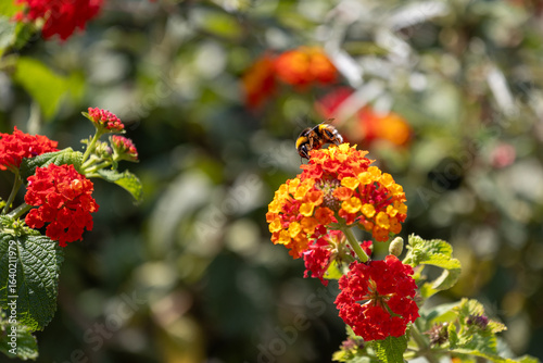 Bumblebee pollinating colorful lantana camara flowers in a garden