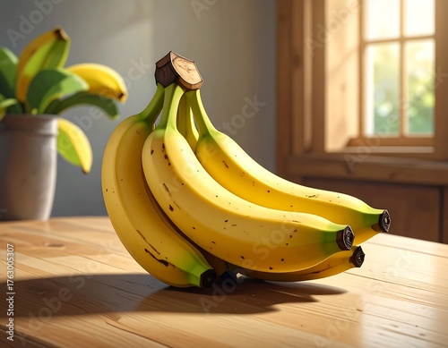 Bunch of ripe bananas on a wooden table, with sunlight and window