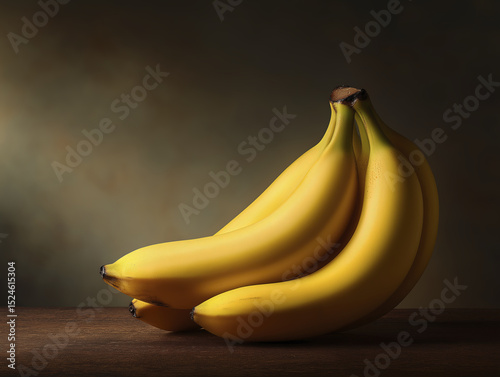 Bunch of ripe, vibrant yellow bananas sits gracefully on table, illuminated by soft light, scene that exudes natural goodness and healthy choices