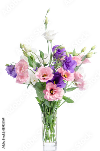 bunch of violet, white and pink eustoma flowers in glass vase isolated on white