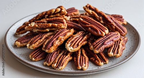 bunch of warm maple pecan twists on a plate on plain white background