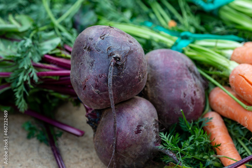 Bunches of Beetroots and Carrots on a Market Stall