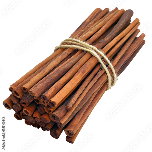 Bundle of cinnamon sticks tied with string, isolated on transparent background