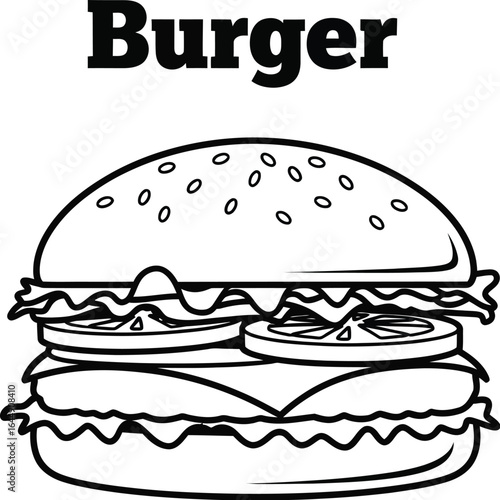 Burger illustration featuring a delicious sandwich with beef, cheese, tomato, and lettuce, perfect for fast food restaurants and culinary designs