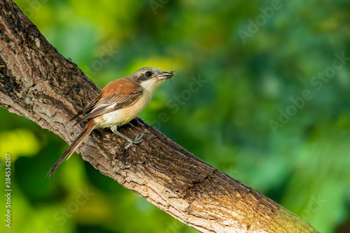 Burmese Shrike perching on a tree branch with an insect in the beak