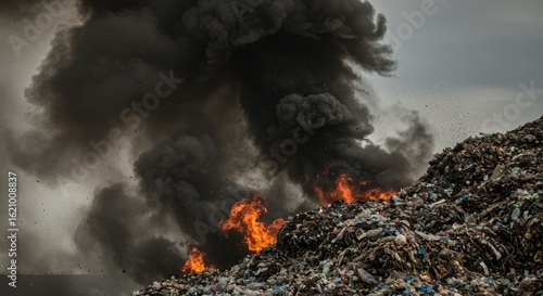 Burning Landfill: Toxic Smoke and Flames Engulfing Waste, Environmental Disaster