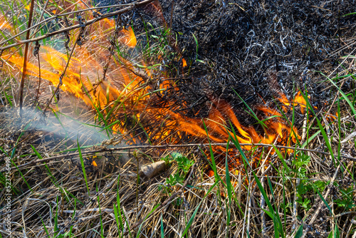 Burning old dry grass. Tongues red flame and burning dry yellowed grass in smoke