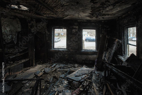 Burnt wooden house interior. Consequences of fire